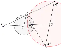 Kreise sind einander geometrisch ähnlich und spiegelsymmetrisch. Zwei Kreise besitzen höchstens zwei Ähnlichkeitspunkte: einen äußeren Ähnlichkeitspunkt P1 und einen inneren P2, siehe oberes Bild. Die Ähnlichkeitspunkte liegen auf der Geraden, die die Mittelpunkte (O,O’) der beiden Kreise verbindet und die als Zentrallinie bezeichnet wird. In diesen Ähnlichkeitspunkten schneiden sich[1]:17