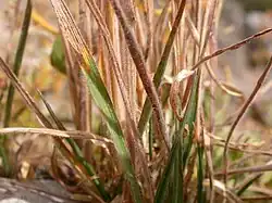 Die hauptsächlich grundständig und wechselständig angeordneten Laubblätter sind in Blattscheide und Blattspreite gegliedert. Die Ränder der Blattscheide sind nur an ihrer Basis verwachsen und sie sind rau behaart. Die ausgefransten, behaarten Blatthäutchen (Ligulae) sind bei einer Länge von 0,8 bis 3 Millimetern schräg länglich mit spitzen bis gestutzten oberen Enden. Die am Halm anliegenden oder ausgebreiteten Blattspreiten sind bei einer Länge von 17 bis 85 Millimetern linealisch sowie nach oben eingerollt oder flach und dann 1,2 bis 2,2 Millimeter breit. Beide Spreitenflächen sind zottig oder kurz flaumig behaart.[4]
