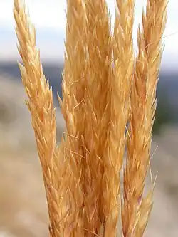 Der oft tief purpur-braune, dichte, rispige Blütenstand ist bei einer Länge von 2 bis 5 Zentimetern und einem Durchmesser von 5 bis 13 Millimetern zylindrisch oder eiförmig. Die Hauptblütenstandsachse ist dicht, flaumig lang behaart.[4] Die gelben, grünen und violett gefleckten[5] Ährchen sind bei einer Länge von 3,9 bis 6,6 (bis 7,5) Millimetern und einem Durchmesser von 1,5 bis 3 Millimetern lanzettlich oder eiförmig. Die erste Hüllspelze ist kahl, einnervig und bei einer Länge von 2,5 bis 4,5 Millimetern lanzettlich mit zugespitztem oberen Ende sowie mit wenigen kurzen Haaren bewimperten Rändern. Die erste Hüllspelze ist kahl oder behaart, dreinervig und bei einer Länge von 3,4 bis 5,5 Millimetern lanzettlich. Die matte Deckspelze ist dreinervig und bei einer Länge von selten 3,5 bis meist 4,5 bis 5,3 Millimetern lanzettlich mit spitzem, glattem oberen Ende. Oberhalb der Mitte der Deckspelze ist eine gekniete, verdrehte, 2 bis 4 Millimeter lange Granne vorhanden. Die gut entwickelte Vorspelze ist 3,7 bis 4,2 Millimeter lang. Die Staubbeutel der drei Staubblätter sind selten 0,6 bis meist 1 bis 1,2 Millimeter lang.[4]