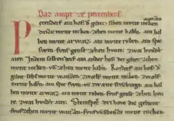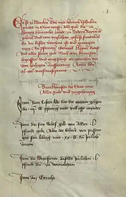 Eine teilweise Fortführung stellt auch das Urbarbuch des Viztumamtes an der Rott[9] dar, angelegt unter Herzog Heinrich XIV. (der Reiche) um 1301–1307; in diesem wird mehrmals auf ein „alt Puch“ (antiquus liber) Bezug genommen, mit dem in Einzelfällen das Älteste bayerische Herzogsurbar gemeint sein kann.[10] Auch das Urbar über das Viztumamt Straubing mit den Gülten des Niederlands und des Nordgaus[11], entstanden ca. 1300, nimmt mehrmals Bezug auf ein „alt puch“[12]. Weitere bayerische Teilverzeichnisse sind das Urbar- und Schuldbuch Herzog Albrechts I. von Straubing-Holland[13], das durch Herzog Albrecht I. von Straubing-Holland um 1360 angelegt wurde, der Appendix ad urbarium Baiuvariae superioris, vicedominatus Monacensis, Summae redituum ex officiis et granariis citra Danubium[14] aus der 1. Hälfte 14. Jhd. oder das Oberbayerische Urbar des Viztumamtes München[15] aus dem 14. Jahrhundert.
