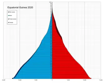 Äquatorialguinea hatte 2022 1,7 Millionen Einwohner.[7] Das jährliche Bevölkerungswachstum betrug + 2,4 %. Zum Bevölkerungswachstum trug ein Geburtenüberschuss (Geburtenziffer: 29,9 pro 1000 Einwohner[8] vs. Sterbeziffer: 8,7 pro 1000 Einwohner[9]) bei. Die Anzahl der Geburten pro Frau lag 2022 statistisch bei 4,2, die der Region West- und Zentral-Afrika betrug 4,9.[10] Der Median des Alters der Bevölkerung lag im Jahr 2021 bei 20,9 Jahren.[11] Im Jahr 2023 waren 38,1 Prozent der Bevölkerung unter 15 Jahre,[12] während der Anteil der über 64-Jährigen 3,1 Prozent der Bevölkerung betrug.[13]