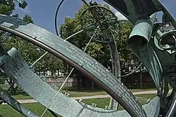 Blick von Südosten auf den Weltzeitring (vorne und hinten unten) und die Hauptskala (hinten) -