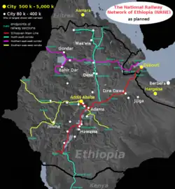 Im September 2010 erklärte die Ethiopian Railway Corporation (ERC) insgesamt 5000 Kilometer neuer Bahnstrecken bauen zu wollen.[3] Der nationale Fünfjahresplan für den Zeitraum von 2010 bis 2015 sah vor, zunächst 2395 Kilometer neue Strecken zu errichten, die 49 Städte verbinden sollen.[4] Die Kosten sollten 4,2 Mrd. Euro betragen.[5] Bereits im März 2000 hatten Äthiopien und der Sudan eine Absichtserklärung über den Bau einer 2000 Kilometer langen Eisenbahnlinie vereinbart. Die Kosten wurden auf rund 1,5 Milliarden US-Dollar (USD) geschätzt. Für die Planung wurden neben lokalen Ingenieuren auch chinesische Ingenieurfirmen eingesetzt. Ob das Projekt nach der Unabhängigkeit des Südsudan weiter verfolgt wird, ist nicht sicher.[6]