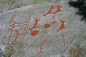 Die Felsritzungen stammen aus der Bronzezeit. Unter anderem findet man hier Bohusläns älteste Schiffsritzung, die etwa 1700 v. Chr. entstand. Die meisten Motive (Menschen, Tiere und Schiffe) sind typisch für schwedische Felsbilder (schwedisch Hällbilder) aber die Tierspur, die vermutlich zu einem Wolf gehört, ist einzigartig.