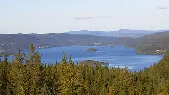 Im See befindet sich neben einigen kleinen Inseln die Insel Myraholmen.