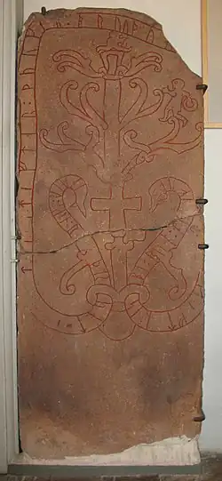 Der Stein aus rotem Sandstein ist 2,1 m hoch, 85 cm breit und 15–20 cm dick und wurde 1690 entdeckt. Die Runenhöhe beträgt 5.0 bis 8,0 Zentimeter. Der Stein ist in der Mitte gerissen, aber wieder zusammengesetzt. Die rechte obere Ecke ist verschwunden. Die detailreiche Ritzung wurde zwischen 1020 und 1050 geschaffen und zeigt mittig ein Kreuz, den Weltenbaum Yggdrasil und zwei menschliche Figuren. Das umlaufende Schlangenband ist unten mit einem Irischen Koppel verbunden. Die Inschrift lautet: