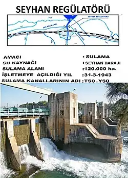 Im Zusammenhang mit dem wachsenden Bewässerungsfeldbau begann Mitte des 20. Jahrhunderts der Bau von Talsperren und Kanälen in der Çukurova. Schon länger hatten die Flüsse Berdan Çayı (Tarsus Çayı), Ceyhan und Seyhan von Zeit zu Zeit ernsthafte Schäden durch Überschwemmungen verursacht, wobei besonders Adana durch den Seyhan tagelang unter Wasser gesetzt wurde, landwirtschaftliche Flächen schwer beschädigt wurden und es sogar zu Todesfällen kam. Mit dem gehäuften Auftreten solcher Überschwemmungen in den 1930er Jahren wurde zur Lösung dieses Problems zuerst 1943 eine Staustufe (Eski Barajı) mit einem großen Wasserverteiler (Seyhan Regulatörü) am Seyhan einschließlich großer Kanäle angelegt. 1956 wurde dann unmittelbar am nördlichen Stadtrand von Adana der Staudamm der Seyhan Barajı eröffnet, der den Seyhan zur Bewässerung, Stromgewinnung und Hochwasserkontrolle der Çukurova aufstaut, und 1967–1972 die Kozan Barajı am Kilgen Çayı, einem Zufluss des Ceyhan. Im Umfeld der Seyhan-Talsperre entstanden vor der Kulisse des Taurus später die Çukurova-Universität sowie neue Wohnviertel für die Çukurova-Metropole.[52]