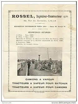 Édouard Rossel machte 1882 seinen Abschluss als Ingenieur am Institut industriel du Nord (École Centrale de Lille) und begann als Dampfmaschineningenieur zu arbeiten. Er gründete 1896 in Lille in der Rue des Sarrazins 82 das Unternehmen, das seinen Namen trug, und begann mit der Produktion von Automobilen.[4] Der Markenname lautete Rossel. 1899 endete die Produktion. Es bestand keine Verbindung zu Automobiles Rossel.