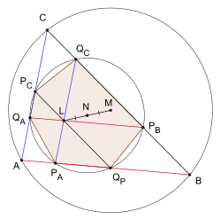 Zieht man durch den Lemoinepunkt Parallelen zu den drei Dreiecksseiten und verbindet man die Schnittpunkte der Parallelen mit den Dreiecksseiten miteinander, so entsteht ein Sechseck, das sogenannte lemoinesche Sechseck.[7] Die Parallelen werden oft Lemoine-Parallelen genannt. Der Umkreis des Sechsecks wird erster lemoinescher Kreis genannt. Der Mittelpunkt dieses Kreises liegt in der Mitte zwischen dem Lemoinepunkt und dem Schnittpunkt der Mittelsenkrechten (also dem Umkreismittelpunkt) des Dreiecks.[8] Zieht man die Antiparallelen (auch Lemoine-Antiparallelen genannt) durch den Lemoinepunkt eines Dreiecks, so schneiden sie sich mit den Seiten des Dreiecks in sechs Punkten. Verbindet man diese, erhält man das Cosinus-Sechseck.[9] Der Umkreis dieses Sechsecks heißt Cosinus-Kreis oder zweiter lemoinescher Kreis.[10]
