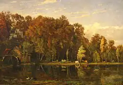 - Der Wasserverlust besteht nicht nur aus dem Abfluss,[5] sondern auch aus dem Überlauf sowie aus der Versickerung im Lehmboden und den Böschungen (Darcy-Gesetz), nicht zuletzt aber auch aus Verdunstung[6] und Evapotranspiration.[7][8] wegen Pflanzen in und am Ufer des Étangs, insbesondere auch von Baumwurzeln, die die Böschungen durchdringen.[9] Teilweise muss auch dem Wasserverlust aufgrund von Kälte und Frost Rechnung getragen werden[10]