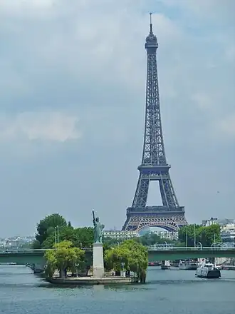 Der Pariser Bildhauer Auguste Bartholdi errichtete am südwestlichen Ende der Insel eine Replik der von ihm 1886 in New York City aufgestellten Freiheitsstatue im Maßstab 1:4 mit einer Höhe von 22 Metern (davon 10,5 Meter Sockel), eingeweiht am 4. Juli 1889 durch den damaligen französischen Staatspräsidenten Marie François Sadi Carnot. Am Einweihungstag feierte Frankreich den hundertsten Jahrestag des Sturms auf die Bastille (14. Juli 1789) und die USA den Unabhängigkeitstag (4. Juli 1776). Der Erbauer Bartholdi protestierte gegen die östliche Ausrichtung der Statue, deshalb drehte man sie im Mai 1937 in Richtung Westen.