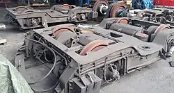 Für die Einheiten wurden völlig neue Drehgestelle entwickelt. Die Triebdrehgestelle besitzen einen geschlossenen Rahmen. Die Übertragung der Brems- und Zugkräfte geschieht durch einen gummigelagerten Drehzapfen. Die Rahmen der Laufdrehgestelle sind sie als offene H-Rahmen ausgebildet, zur Kraftübertragung wird ein Zugkraftlenker verwendet.[11] Die Treibradsätze werden über Radscheibenbremsen abgebremst. An den Treibradsätzen sind zusätzlich noch Klotzbremsen vorhanden, welche seit der Hauptausbesserung 1993 nur als Schleuderschutzbremsen verwendet werden. Die Laufradsätze sind mit je zwei Wellenscheibenbremsen ausgerüstet. Ergänzend zur mechanischen Bremse besitzen die Triebwagen noch eine fremderregte, thyristorgesteuerte elektrodynamische Hochleistungswiderstandsbremse, die Betätigung erfolgt ergänzend mit der Druckluftbremse, wobei die Bremssteuerung vorrangig auf die Elektrodynamische Bremse zugreift. Die dabei anfallende Bremsenergie wird in den am Dach angeordneten fahrtwindgekühlten Bremswiderständen in Wärme umgewandelt.[12]