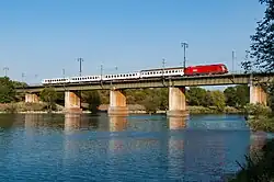 REX mit der „T.R.A.M. – Zeitreise Wien–Pressburg“-Garnitur auf der Stadlauer Ostbahnbrücke