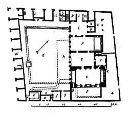 d – Palästra / h – Schwimmbecken / i, l – Vestibulum, Hof / p – Apodyterium / q – Tepidarium / r – Laconicum / s – Caldarium / x, y – Öfen
