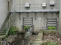 Ökodurchlass mit Betriebsauslässen und Stauwand des Hochwasserrückhaltebeckens Widey in Warstein, Blickrichtung flussaufwärts