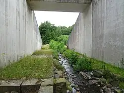 Ökodurchlass des Hochwasserrückhaltebeckens Widey in Warstein, Blickrichtung flussabwärts