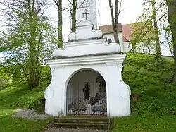 Die neubarocke Ölbergkapelle in Eppishausen, einer Gemeinde im Landkreis Unterallgäu in Bayern, wurde im Jahr 1912 von Franz Xaver Lutzenberger, nach Plänen des Architekten Wolf, erbaut. Die denkmalgeschützte Kapelle befindet sich am nördlichen Fuß des Kirchberges und ist ein kleiner rechteckiger verputzter Backsteinbau.[1] Gedeckt ist das Gebäude mit einem Satteldach, darunter befindet sich ein Traufgesims. Zur Nordseite hin ist die Kapelle mit einer Rundbogenarkade offen. Diese wird von toskanischen Pilastern mit außen angebrachten Voluten flankiert. Der Schweifgiebel darüber besitzt ein kräftiges, profiliertes Gesims. Der Giebel ist dadurch in zwei Geschosse aufgeteilt. Die Figurengruppe in der Kapelle wurde um 1720 geschaffen und befand sich zeitweise im Pfarrhaus.