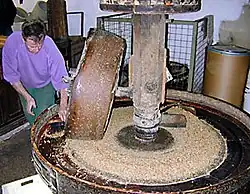 Traditionelle Ölmühlen waren im deutschsprachigen Bereich ursprünglich Wassermühlen. Sie bestanden aus einem Samenstampfwerk, einem Röstkessel und einer sogenannten Schlägel-Keilpresse.[12] Der Prozess der Ölgewinnung wurde als Ölschlagen bezeichnet.[13] Der Ölmüller wurde vielfach Ölschläger genannt.[14]