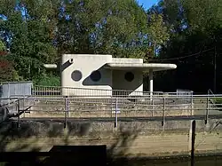 Der Hochwasserabschlag erfolgt über eine ausgedehnte und aufwendig konstruierte Schwelle. Die eigentliche Schwelle ist mit Pflastersteinen befestigt, hinter ihr folgt eine kleine Vertiefung zur Aufnahme geringer Überflussmengen. Dem entlang der Schwelle führenden Spazierweg ist parallel ein aufgeständerter Holzbohlenweg beigefügt worden. So ist im Überschwemmungsfall eine Umrundung des Sees trockenen Fußes möglich, da das übrige Niveau der Wege höher als im Schwellenbereich ist. Auf der Flussseite der Schwelle sind Edelstahl-Rohre so beweglich gelagert, dass sie im Hochwasserfall für Wassersportler eine Barriere bilden und vor einer Fahrt in den See abhalten.