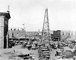 Die erste kommerzielle auf Erdöl ausgerichtete und erfolgreiche Bohrung führte Edwin L. Drake am 27. August 1859 am Oil Creek in Titusville, Pennsylvania, durch. Drake bohrte im Auftrag des amerikanischen Industriellen George H. Bissell und stieß in nur 21 Meter Tiefe auf die erste größere Erdöllagerstätte. Im selben Jahr produzierten in den Vereinigten Staaten 34 Unternehmen Petroleum mit einem Umsatz von fünf Millionen US-Dollar. Die ersten Erdölraffinerien entstanden.[60] Bis 1864 stieg der Ölpreis auf den Höchststand von 8,06 Dollar pro Barrel (159 Liter). Inflationsbereinigt mussten damals im Jahresdurchschnitt 166,04 US-Dollar gezahlt werden.[61]