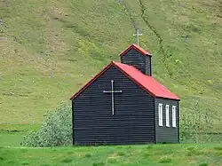 Die Holzkirche Kirkjubólskirkja des Hofes Kirkjuból wurde 1886 erbaut und 1978 originalgetreu renoviert.[6] Sie ist 7,74 m lang und 4,54 m breit und hat im Westen einen Dachreiter. Seit 1990 steht sie unter Denkmalschutz.[7] Bereits vor der Reformation stand hier eine Kirche, die der hl. Maria und dem hl. Thórlák geweiht war.[8]
