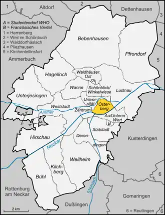 Das Wohngebiet auf dem Südhang des Österbergs ist in Zentrumsnähe und lediglich durch eine Straße, die Doblerstraße, erreichbar.[6] Auf dem Berg befinden sich der 40 m hohe Aussichts- und Sendeturm Österbergturm (431 m), mehrere Verbindungshäuser, das Land- und Amtsgericht Tübingen mit Untersuchungsgefängnis, das Landesstudio Tübingen des SWR, die Alte Anatomie der medizinischen Fakultät der Universität Tübingen und ein Kindergarten. Am Fuß der dem Neckar zugewandten Südseite befand sich von 1882 bis zur Reichspogromnacht 1938 die Tübinger Synagoge, daran erinnert dort seit 1978/2000 ein Denkmal.