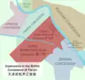 Das Konzessionsgebiet war vergleichsweise klein und schon dicht von Einheimischen besiedelt. Seine Bahn- und Flussgrenze erschienen jedoch für Geschäfts- und Handelszwecke günstig. Dennoch hatten Politik und Wirtschaft im Mutterland wenig Interesse an dieser Konzession, da Österreich-Ungarn keine weiteren Stützpunkte besaß, und daher gegen Entgelt auf die Handelswege anderer angewiesen war.[2] Bis 4. August 1902 wurde das Gebiet von der Provisorischen Regierung von Tientsin verwaltet, danach übernahm Konsul Karl Bernauer die Verwaltung und unterzeichnete schließlich am 27. Dezember 1902 einen Pachtvertrag mit dem chinesischen Kreisintendanten von Tientsin. Darin war festgelegt, dass das Gebiet Österreich-Ungarn auf unbegrenzte Zeit zugesprochen wurde. Grundbesitz verblieb aber in den Händen der Einheimischen. 1903 wurde mit dem Bau eines Konsulats und dem darin befindlichen Wohnsitz des Konsuls begonnen, das am 22. September 1905 eröffnet wurde. Bis dahin musste dieser sich eine Wohnung in der französischen (ab 1904 in der deutschen) Konzession mieten. Am 21. November 1906 wurde eine eiserne Drehbrücke, die in internationaler Kooperation entstand, eröffnet, welche die Konzession mit dem chinesischen Tientsin verband. Darauf verlief eine elektrische Straßenbahnlinie, die das chinesische, österreichisch-ungarische und italienische Tientsin verband. Zum weiteren Ausbau des Konzessionsgebiets wurde 1905 die Hotung Baugesellschaft (H.B.G.) gegründet. Vorzeigeprojekt derer war der Bau einer Hauptstraße, welche zwischen Drehbrücke und italienischer Konzession verlaufen sollte. Die Neue Straße (ab ca. 1906 Baron-Czikann-Straße genannt) wurde in den Folgejahren mit Gebäuden im reduzierten Gründerzeitstil ausgebaut. Daneben wurde ein Offizierskasino, ein Theater, ein Krankenhaus, ein öffentliches Bad und eine Schule erbaut.[3] Erschwert wurde die Arbeit durch langwierige Enteignungen und Umsiedlungen.[4] Im Herbst 1908 trat der neu gegründete Gemeinderat erstmals zusammen. Er diente als verbindendes Element zwischen der politischen Administration der Konzession und der Hotung Baugesellschaft und setzte sich aus acht vom Konsuln ernannten Mitgliedern zusammen, von denen jeweils vier aus Österreich-Ungarn und aus China waren. Im Oktober 1908 wurde mit dem Niederlassungsreglement, das auf der Gemeindeordnung von Klagenfurt basierte, eine Art gesetzliche Grundlage geschaffen. Obwohl das in drei Sprachen (deutsch, ungarisch, chinesisch) veröffentlichte Reglement beispielsweise die schrittweise Modernisierung des chinesischen Baubestands nach westlichen Standards vorsah, stagnierte die wirtschaftliche Entwicklung der Konzession ab 1909, da sie für österreichisch-ungarische Firmen unattraktiv blieb. Zudem ereignete sich am 30. August 1911 eine Flutkatastrophe, die etwa 100 Lehmhäuser zerstörte.