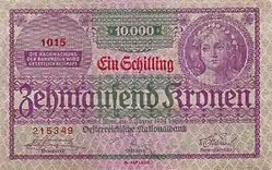 Weiter bestehende enorme Budgetdefizite in Deutschösterreich (unter anderem zur Subventionierung der Lebensmittel) und Währungsspekulationen trieben die Inflation weiter an, die mit eigenen Mitteln nicht zu stoppen war. Der Wert der Papierkrone gegenüber der Goldkrone fiel bis August 1922 auf 14.400 : 1.[7] Bundeskanzler Ignaz Seipel benötigte 1922 ausländische Hilfe und einen international überwachten strikten Sparkurs, damit die Staatsfinanzen wieder ins Lot gebracht werden konnten. Als dies gelang, bereitete die Bundesregierung Seipel I 1924 die Einführung der Schillingwährung vor. Diese Währungsreform wurde vom Nationalrat am 20. Dezember 1924, einen Monat nach dem Rücktritt Seipels, beschlossen und mit 1. März 1925 realisiert (In der folgenden mehrmonatigen Übergangszeit wurden österreichische Kronen noch akzeptiert). Der Wert eines Schillings entsprach 10.000 „Papierkronen“.