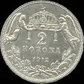„VIRIBVS VNITIS“ | „II CORONÆ“, Adler mit Wappen, Wert, Jahr der Prägung | „FRANC•IOS•I•D•G•IMP•AVSTR•REX BOH•GAL•ILL•ETC•ET AP•REX HVNG•“, Franz Joseph I. ohne Lorbeerkranz, unter Bildnis mit „ST•SCHWARTZ“ | 1912–1913 | |