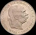 100 Kronen | „C CORONÆ“, Adler mit Wappen, Wert, Jahr der Prägung | „FRANC•IOS•I•D•G•IMP•AVSTR•REX BOH•GAL•ILL•ETC•ET AP•REX HVNG•“, Franz Joseph I. ohne Lorbeerkranz, unter Bildnis mit „ST•SCHWARTZ“ | 1909–1914 | ||||