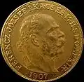 20 Kronen[21] | 21 mm | 6,77 g 900 ‰ Au, 100 ‰ Cu |