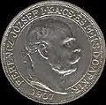 “BIZALMAM AZ ŐSI ERÉNYBEN”, Ornamente | „MEGKORONÁZTATÁSÁNAK NEGYVENEDIK ÉVFORDULÓJÁRA“, 1867–1907, Krönungsszene, Wert, Münzzeichen „K•B“ (zum 40-jährigen Krönungsjubiläum) | „FERENCZ JÓZSEF I•K•A•CS•ÉS M•H•S•D•O•AP•KIR•“, Franz Joseph I., Jahr der Prägung 1907 (Neuprägung erkennbar an der eher rötlichen Farbe und den nicht mattierten erhabenen Münzteilen)[17] | 1907 | |
