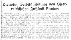 Der vorgenannte Schmieger wurde 1935 im seinerzeitigen Ständestaat vom Sportführer und Vizekanzler Ernst Rüdiger Starhemberg zum „Gruppenführer“ für Fußball ernannt, aber bereits im folgenden Jahr durch den nunmehrigen Obergerichtsrat Richard Eberstaller abgelöst. Nach dem Anschluss Österreichs an das Deutsche Reich am 12. März 1938 war es der ÖFB-Präsident und nunmehrige Obergerichtsrat Eberstaller – der in jenen Jahren auch durch politische Todesurteile, Kunstdiebstahl und Immobilienschiebereien auffiel –, der den ÖFB am 28. März de facto und am 7. Juni de jure auflöste (womit der ÖFB aus der FIFA austrat) und damit auch im Fußball die Gleichschaltung vollzog.[6] Gleichzeitig fand auch der Professionalismus einstweilen ein Ende. Wohl ein Absurdum, war es doch Eberstaller, der 1926 den Verband als Gegenentwurf zum amateuristischen Arbeiterfußball aufstellte.