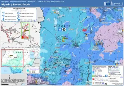 - ↑ HEAVY RAINFALL FORECAST BULLETIN No: 202504008. (PDF; 423 KB) Nigerian Meteorological Agency, abgerufen am 31. Mai 2025 (englisch).