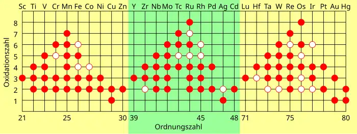 - Die Anzahl der Oxidationszustände nimmt in der 4. Periode bis zum Mangan zu und sinkt dann wieder. Das ist auf die stärkere Anziehungskraft der Protonen im Kern zurückzuführen, wodurch die Abgabe von Elektronen erschwert wird.