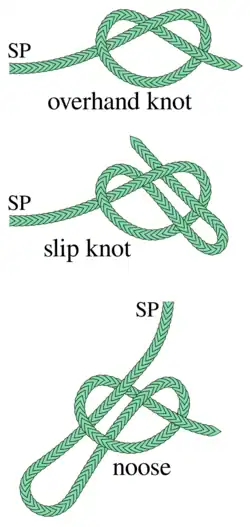 Überhand-, Slipknoten und Schlinge. SP=Standing Part (Festes Ende)