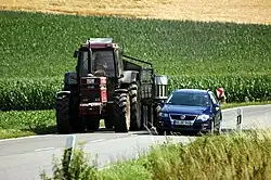 Umstritten sind auch Überholvorgänge bei Traktoren mit großen Anhängern oder schwerfälligen Gespannen. Beim Abbiegen von Feldern auf Landstraßen können diese für einen längeren Zeitraum die gesamte Fahrbahn blockieren. Besonders in der Dunkelheit oder bei Nebel sind nicht oder schlecht beleuchtete Anhänger schwer zu erkennen und verlangen von den Autofahrern besondere Aufmerksamkeit.[4]