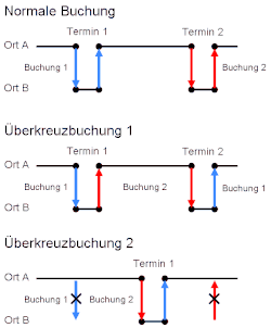 • Buchung 1: Hinflug irgendein Termin A → B (wird nicht angetreten), Rückflug Termin 1 B → A
