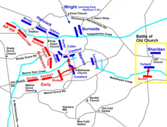 Lee befürchtete, dass die Potomac-Armee nach der Pattsituation am Totopotomoy Creek erneut versuchen würde, ihn rechts zu umgehen. Deshalb beauftragte er eine Kavalleriebrigade, die Lage an der wichtigen Straßenkreuzung bei Cold Harbor aufzuklären. Am Nachmittag erreichte die konföderierte Kavallerie den Matadequin Creek und vertrieb die südlich davon eingesetzten Sicherungen auf das Nordufer des Baches. Um die Stellungen halten zu können, setzte Sheridan nach und nach eine gesamte Kavalleriedivision ein. Das entstandene Patt wurde erst durch den Einsatz der Kavalleriebrigade Custers beendet. Die Konföderierten wichen aus und die Nordstaatler biwakierten ungefähr 2,5 km nördlich der Straßenkreuzung bei Cold Harbor.[31] Trotz dieser Niederlage erhielt General Lee die wichtige Information, dass sich bei Cold Harbor keine Infanterieverbände der Potomac-Armee befanden.