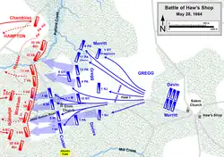 Lee beauftragte eine Kavalleriedivision, durch gewaltsame Aufklärung die Absicht der Potomac-Armee herauszufinden. Am Morgen des 28. Mai traf die Division Wade Hamptons bei einer Straßenkreuzung in der Nähe der Überreste einer Ansiedlung namens Haw’s Shop auf die 2. US-Kavallerie-Division unter Generalmajor David Gregg. Mehrere Stunden wogte die Schlacht hin und her, bis Brigadegeneral Custers Kavalleriebrigade eintraf und die Konföderierten zunächst planmäßig auswichen, später jedoch flohen. Die Schlacht war die längste Kavallerieschlacht nach der Schlacht bei Brandy Station.[26] Der entscheidende Unterschied zu früher geschlagenen Reiterschlachten auf dem östlichen Kriegsschauplatz war jedoch ihre Durchführung: Die Kavalleristen kämpften wie die Infanterie abgesessen und aus Feldbefestigungen. Die Verluste waren hoch: Die Union verlor 365, die Konföderation 378 Soldaten.[27]