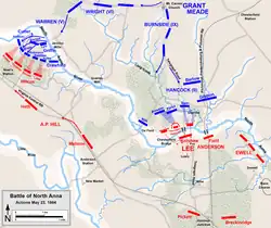 Wegen der kürzeren Marschwege erreichte die Nord-Virginia-Armee die Übergänge über den North Anna vor der Potomac-Armee. Lee erkannte, dass für eine erfolgreiche Verteidigung einzig das Gelände an der Ox Ford geeignet war. Den Unionstruppen gelang am 23. Mai der Übergang nördlich davon. Die Nord-Virginia-Armee hatte Stellungen in einem auf dem Kopf stehenden „V“ angelegt und beabsichtigte nun, die Potomac-Armee durch die Spitze des „V“ in zwei Teile zu spalten. Grant und Meade liefen in diese Falle.