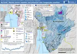 Die Starkregenfälle betrafen über 179.200 Menschen im Land. Schätzungen nach sind etwa 40.000 Hektar Landwirtschaftsfläche von den Überschwemmungen betroffen, was etwa 10 Prozent der landwirtschaftlichen Gesamtfläche Burundis ausmacht. Etwa 80 Prozent der Familien in Burundi erwerben ihr Geld in der Landwirtschaft.[6] Der Wasserspiegel des an der Westgrenze des Landes gelegenen Tanganjikasees stieg durch die Regenfälle seit März um 1,76 Meter auf ein Höhenniveau von 776,76 Meter. Es war der stärkste Anstieg seit 60 Jahren.[7] Die Überschwemmungen betrafen 39 Unterbezirke (collines, dt. „Hügel“) in den neun Bezirken (communes) Mutimbuzi und Kabezi in der Provinz Bujumbura Rural, Muha, Mukaza und Ntahangwa in der Provinz Bujumbura Mairie, Muhuta, Bugarama und Rumonge in der Provinz Rumonge und Nyanza-Lac in der Provinz Makamba.[8] Der Zugang zu Wasser und sanitären Einrichtungen verschlechterte sich durch das Hochwasser insbesondere in Bujumbura Mairie, Mutimbuzi und Rumonge, wo bereits seit Januar ein Anstieg von Cholera-Fällen verzeichnet wird.[6]