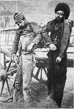 Legende: Braun: „Turanian“ (Türkisch-Sprecher ohne Lasen und Afscharen); Blau: Araber (dunkelblau: niedergelassene Lebensweise; hellblau: nomadische Lebensweise); Grün: Armenier; Gelb: Kurden.