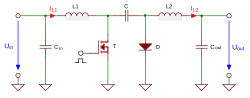 Wird der Transistor T eingeschaltet, so liegt die Induktivität L1 in Reihe zur Versorgungsspannung, und der Strom IL1 beginnt zu steigen. Nach dem Abschalten des Transistors fließt dieser Strom aufgrund der Lenz'schen Regel weiter und lädt den Kondensator C über die Diode D. Der Strom in der Induktivität L1 nimmt dabei ab, die Spannung am Kondensator zu. Nach dem erneuten Einschalten des Transistors wird die Induktivität L1 nachgeladen, und der Strom IL1 steigt. Gleichzeitig beginnt nun ein negativer Strom IL2 zu fließen, der, ausgehend von Kondensator, über die Induktivität L2 und über die Last (inklusive Ladekondensator) fließt und dem Kondensator Energie entzieht. Am Ladekondensator des Ausgangs baut sich somit eine negative Spannung auf. Nach erneutem Abschalten des Transistors wird der Kondensator vom Strom IL1 nachgeladen. Gleichzeitig fließt, ebenfalls bedingt durch die Lenz'sche Regel, der von der Induktivität L2 hervorgerufene Strom IL2 durch die Last und die Diode weiter.