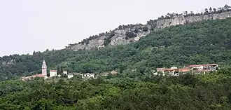 Das Dorf befindet sich am Westhang der Geländestufe, an der das Hochplateau des Karst steil zur Küstenebene hin abfällt. Unmittelbar östlich des Dorfes befinden sich Felswände, die – ähnlich wie im nahen Osp – bei Kletterern beliebt sind.