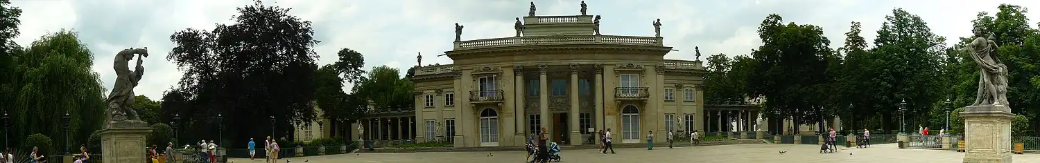 Der Łazienki-Palast wurde nach dem Warschauer Aufstand 1944 von der deutschen Wehrmacht gebrandschatzt und nach dem Zweiten Weltkrieg wiederaufgebaut.[1]