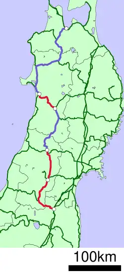 Nach verlassen der Stadt Fukushima führt die Strecke bis Yonezawa durch hügeliges, bewaldetes Gebiet, anschließend bis Shinjō durch dünn besiedeltes, landwirtschaftlich genutztes Land (ausgenommen die Stadt Yamagata).