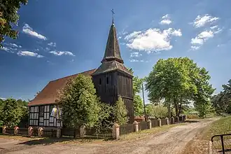 Die Dorfkirche gehört zu den ältesten pommerschen Fachwerkkirchen mit nur wenigen Riegeln und Ständern aus dem 17. Jahrhundert. Bis dahin evangelisch, wurde sie 1945 von der katholischen Kirche in Besitz genommen und trägt heute den Namen Kościół Matki Boskiej Nieustającej Pomocy (Kirche Unserer Lieben Frau von der immerwährenden Hilfe).