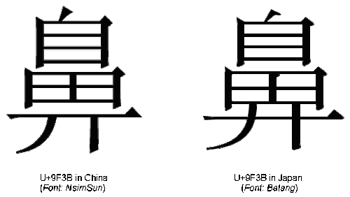 Verschiedene Zeichensätze zeigen das Zeichen von Codepoint U+9F3B leicht unterschiedlich, die japanische Schreibweise hat die beiden Striche unten verlängert.