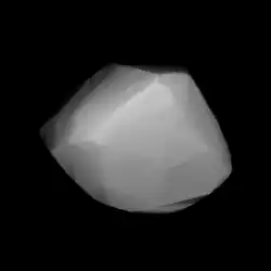 Mit einer Auswertung photometrischer Daten des Lowell-Observatoriums und des Gaia DR2-Katalogs konnten dann im Jahr 2019 aus allen verfügbaren Lichtkurven und Messdaten zwei neue alternative Lösungen für die Position der Rotationsachse des Asteroiden bestimmt werden. Das neue Modell wies allerdings eine prograde Rotation im Gegensatz zu den früheren Ergebnissen auf. Die Ursache lag in einer leicht falschen Periode der zuvor veröffentlichten Lösung. Die Rotationsperiode wurde jetzt durch die Methode der konvexen Inversion zu 14,08574 h bestimmt.[16] Zur Bestätigung des Ergebnisses wurde die Berechnung 2021 mit allen zu dieser Zeit verfügbaren Daten wiederholt. Es wurden zu den bereits früher verwendeten Daten auch solche der All-Sky Automated Survey for Supernovae (ASAS-SN), des Asteroid Terrestrial-impact Last Alert System (ATLAS), des United States Naval Observatory (USNO) und Observatorien der Catalina Sky Survey sowie von neuen photometrischen Beobachtungen des Asteroiden im März und Juni 2020 durch die beiden TRAPPIST-Teleskope in Chile und Marokko berücksichtigt. Es konnten daraus wieder Gestaltmodelle mit einem mittleren Durchmesser von 44 ± 2 km für zwei alternative Positionen der Rotationsachse mit prograder Rotation berechnet werden, wobei die Rotationsperiode sehr genau zu 14,08573 h bestimmt werden konnte. Ein Vergleich mit der bereits erwähnten Sternbedeckung 2003 sowie einer weiteren am 20. Oktober 2016 ermöglichte es zwar, eine der beiden Alternativen zu bevorzugen. Für eine sichere Entscheidung wurden aber noch weitere Beobachtungen als notwendig erachtet.[17]